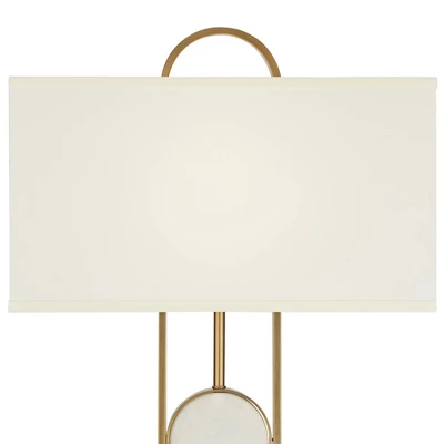 Brighten your decor the modern way with this tall floor lamp design from Possini Euro Design. The lamp base has an open profile with three vertical poles and twin discs with white marble. Base and poles are in a warm gold finish. There is additional marble at the base, and a rectangular shade in a white Shantung silk fabric.