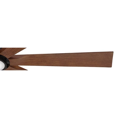 The Defender™ large outdoor ceiling fan from Possini Euro Design® is rated for use in damp locations. It comes in a matte black finish motor and eight koa finish ABS blades with a 60-inch blade span. An energy-efficient LED light module includes a polycarbonate lens. A handheld remote control is included for operation.