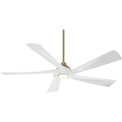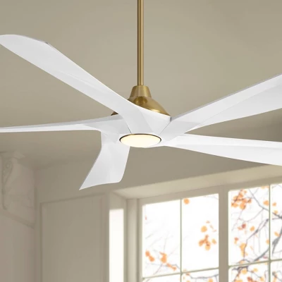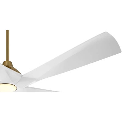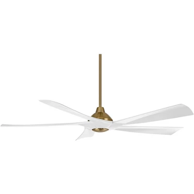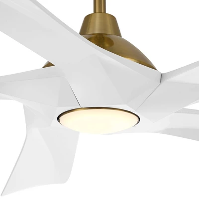 - Faceted soft brass finish motor housing. Five matte white finish molded ABS blades.