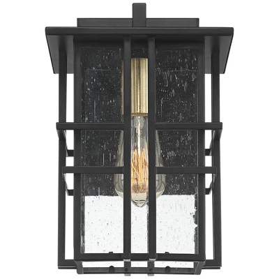 - Black finish. Seedy glass. Bulb socket in a burnished brass finish.