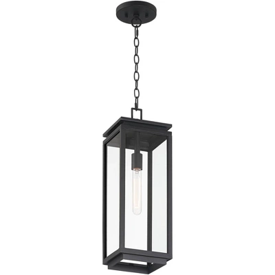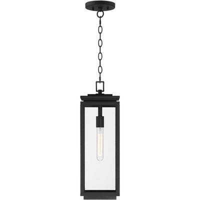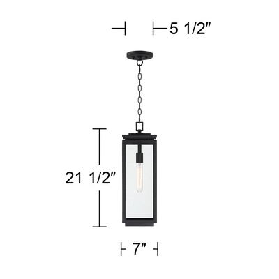 From Possini Euro Design brand of lighting, this outdoor hanging light offers clean lines and a crisp matte black finish. The modern profile features sturdy, die-cast construction and a lantern silhouette with squared corners for a precise look and feel. Clear glass panels keep the bulb (not included) in view, perfect for adding character to outdoor areas. A versatile design that works well adorning your main entryway or patio space.