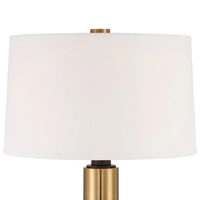 The Boulevard floor lamp offers a modern luxe look for seating areas and living room lighting. Placed next to a sofa or chair it provides bright lighting for reading, or you can place it in a corner for general room illumination. The segmented column comes in a warm gold finish with contrasting bronze accents at neck and mid-column. A tapered white fabric drum shade and 3-way socket switch completes the look.