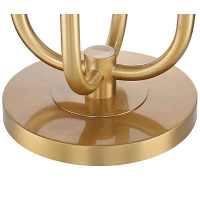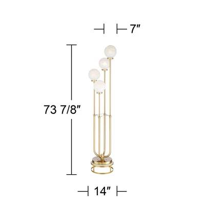 Get glamorous with your lighting. This Mid-Century Modern floor lamp from Possini Euro Design® is a gorgeous addition to any living space. It comes in a warm gold finish metal frame, with four arms that level off at different heights, each supporting a glass globe shade. Energy-efficient LED bulbs are included for use with this lamp. A marble top riser is included to give the lamp extra height and presence in a room.