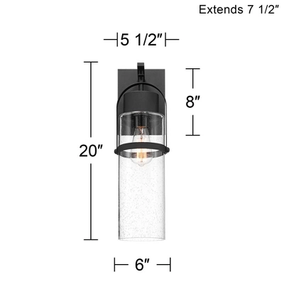 - 20″ high x 6″ wide. Extends 7 1/2″ from the wall. Backplate is 8″ high x 5 1/2″ wide. Center of mounting point to top of fixture is 3 1/2″. Weighs 5 lbs.