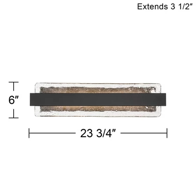 - 23 3/4″ wide x 6″ high. Extends 3 1/2″ from the wall. Backplate is 20 1/2″ wide x 4 1/4″ high. Center of mounting point to top of fixture is 2 1/2″. Weighs 9 lbs.