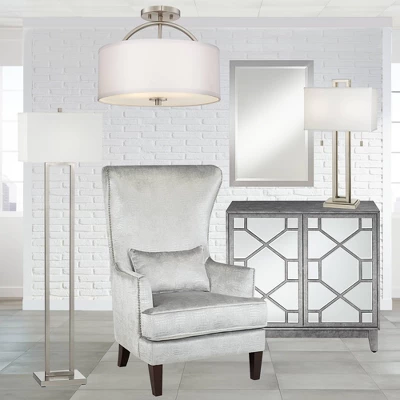 Possini Euro Design Halsted Modern Ceiling Light Semi Flush Mount Fixture 15″ Wide Brushed Nickel 2-Light Oatmeal Linen Drum For Bedroom Living Room