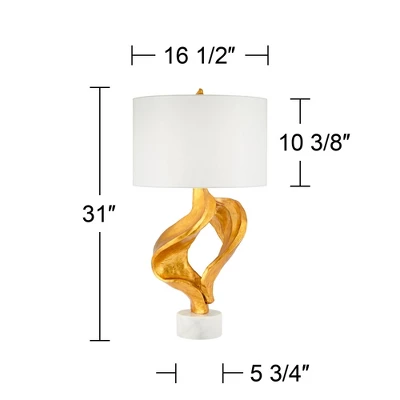 Modern style shines in this elegant lamp design from the Possini Euro Design brand. The lamp features an abstract, sculptural lamp base done in a gleaming gold leaf finish. The gold is given a luxury accent with the addition of a white marble accent at the bottom. Up top is a white color drum shade that lends to the sleek and sophisticated style.
