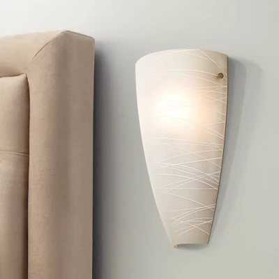 A great look for hallways, bathrooms, kitchens, or anywhere else you need an elegant contemporary touch. This pocket wall sconce features a gently tapering design and frosted art glass with white free-form stripes, which give it an unusual frenzied touch. Brushed nickel accent knobs on the sides complete the decorative look.