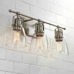 Classic styles are getting modern upgrades to create the perfect blend of old and new. From the Possini Euro Design brand, this farmhouse brushed nickel bath light boasts warmth and simplicity, creating a comfortable look in your bathroom. This three light fixture can be installed horizontally with the lights pointing up or down.
