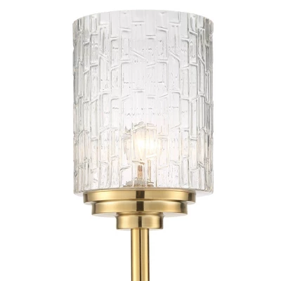 - Antique brass finish base, pole and accents. Metal construction. Stone pattern crystal glass shade.