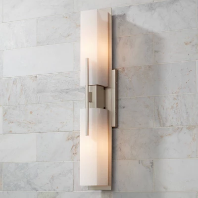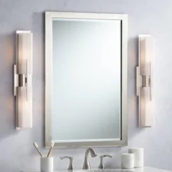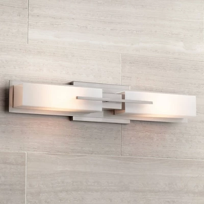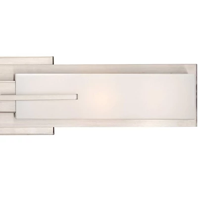 Add a comforting contemporary look to your bath or vanity area with this set of two white glass and satin nickel bath bar light fixtures from the Possini Euro Design Midtown collection. Attractive and versatile transitional style wall fixture can be mounted vertically as shown, or horizontally. Add one to each side of a bathroom mirror on the vertical, or hang horizontally above the mirror. This chic light looks great in any direction.