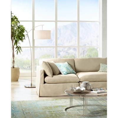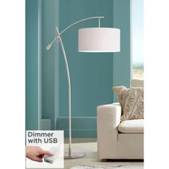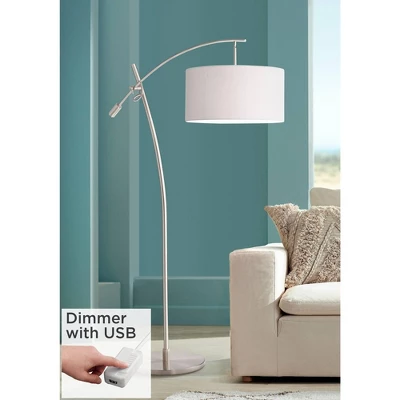 Place this sleek and modern brushed nickel arc floor lamp with a USB dimmer next to your favorite chair and settle in with a book for an enjoyable read. The contemporary design features an adjustable boom arc arm that’s perfect for reading or task lighting. An off-white linen drum shade adds to the simple and stylish design. This lamp can also stand in for a table lamp if there isn’t room for a side table. The tabletop dimmer works with dimmable CFL and dimmable LED bulbs, as well as halogen and incandescent bulbs, and it also comes with a built-in USB port, allowing you to easily charge phones and other devices.