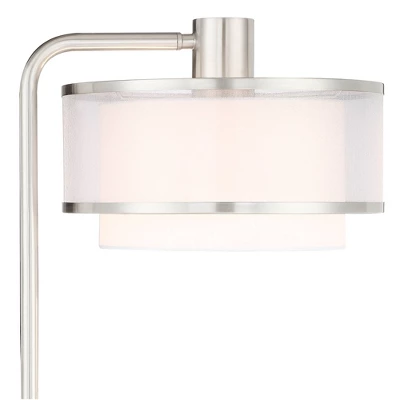 Double up on function while you energize a modern room with style. Adding a handy glass tray table, designers at Possini Euro Design® present an enticing option for illuminating a space dedicated to work and leisure alike. With a brushed nickel finish metal body and an outer silver organza shade that enhances an inner white linen shade, its finished look creates stylish verve and attitude. These sleek floor lamps feature a handy USB port and operates with an on-off rocker switch.