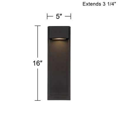 - 16″ high x 5″ wide. Extends 3 1/4″ from the wall. Distance from mounting point to the top of the fixture is 7″. Weighs 2.9 lbs.