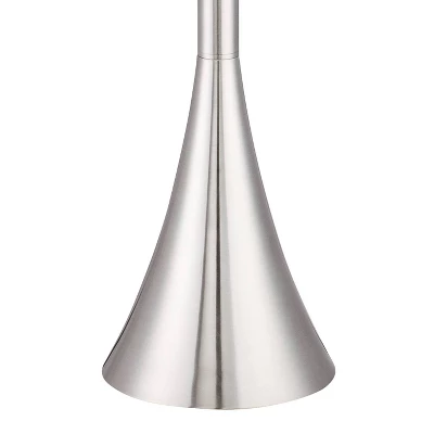 Brighten a contemporary or modern living space with the chic style of this metal torchiere floor lamp from the Possini Euro Design® brand. The look is smooth and alluring with subtle curves and a sleek brushed nickel finish. On top, a white glass shade flares upward, balancing the tapered base below and completing the look. A black finish round riser is included to give the lamp extra height and presence in a room.