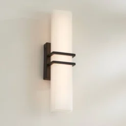 Upgrade your bathroom with the sleek, modern look of this linear bath light. This bathroom wall light features a rectangular silk-screen glass shade set against a handsome black finish backplate. Energy-efficient LED modules are built directly into the design to provide power-saving lighting. Can be installed vertically or horizontally.