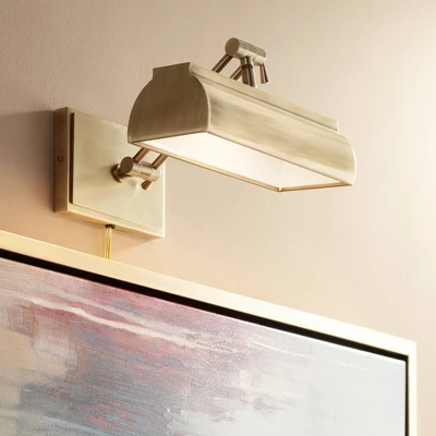 Add this smooth picture light to your decor for superior wall illumination. Finished in a lovely antique brass, this design lets you illuminate artwork, special objects, sheet music and more. The shade and arms are conveniently adjustable, so you can direct the light as you wish. The fixture’s wiring is concealed behind a full-length solid brass back plate for sleek styling. Plug-in cord with on/off switch.