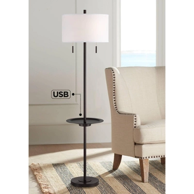 - Valet floor lamp with tray table and USB port. Type-A USB port located under the table. From the Possini Euro Design brand.
